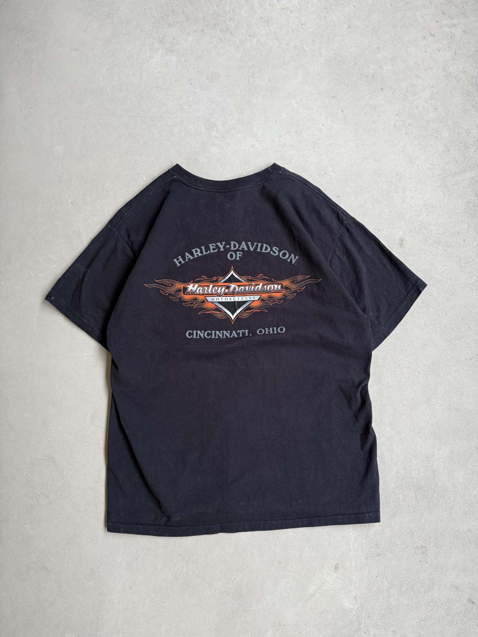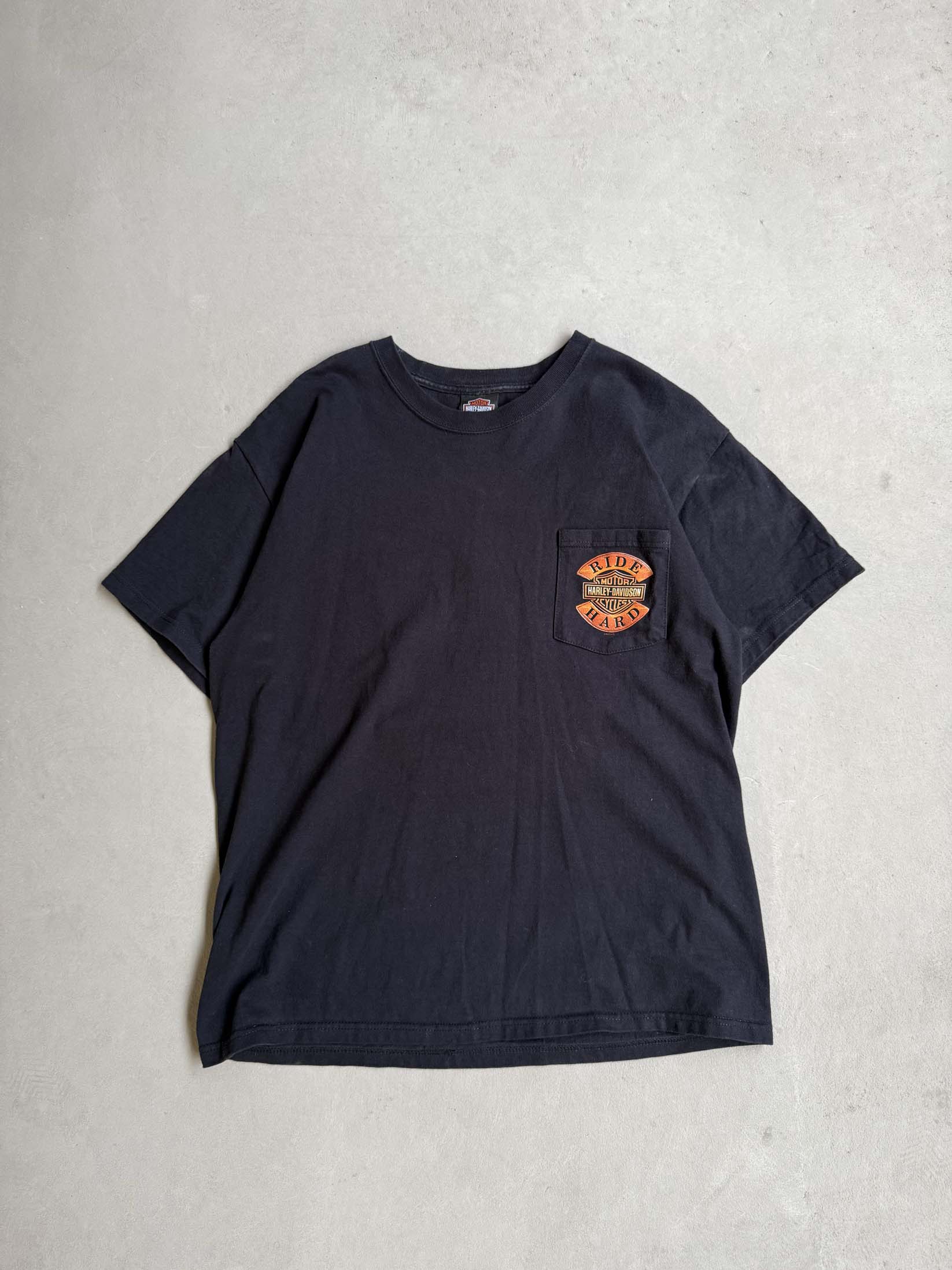Harley Davidson T-shirt with a pocket on the front and graphic on the back.