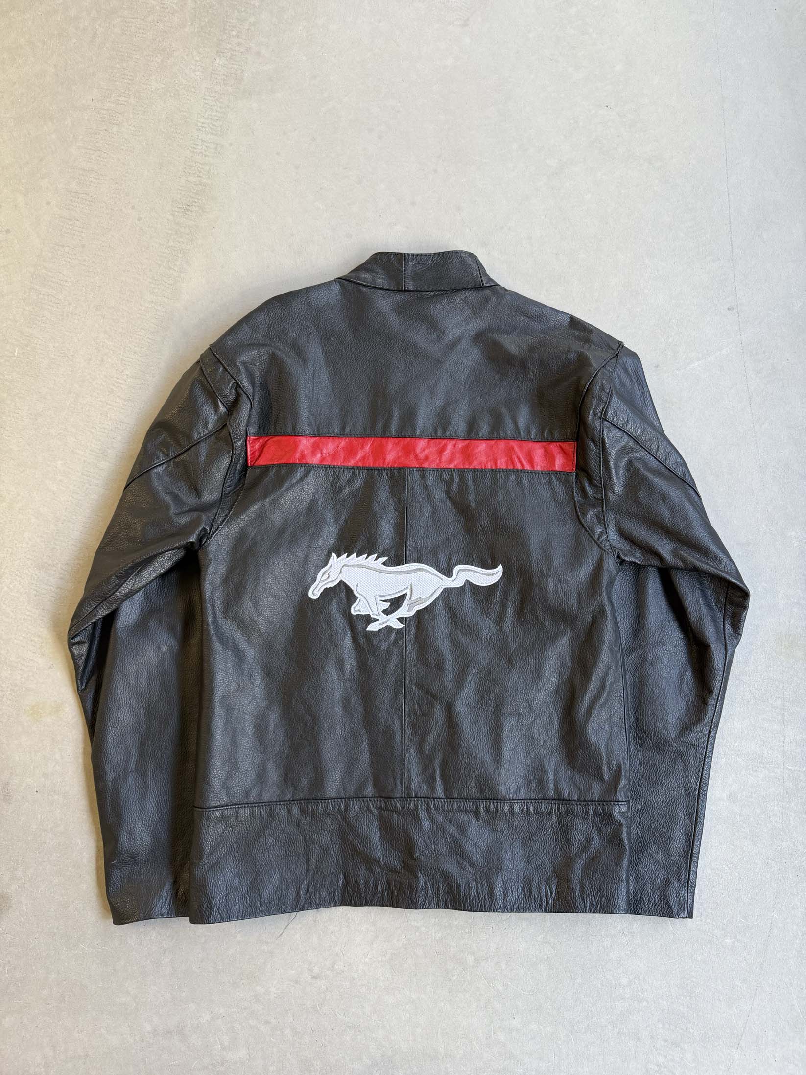This Vintage Mustang leather jacket features a red stripe detail across the front and back, with Mustang-horse embroideries also on both sides. The collar has a Velcro closure detail as well as Mustang-text embroideries. The straight lines and design of the jacket give it a streamlined look.