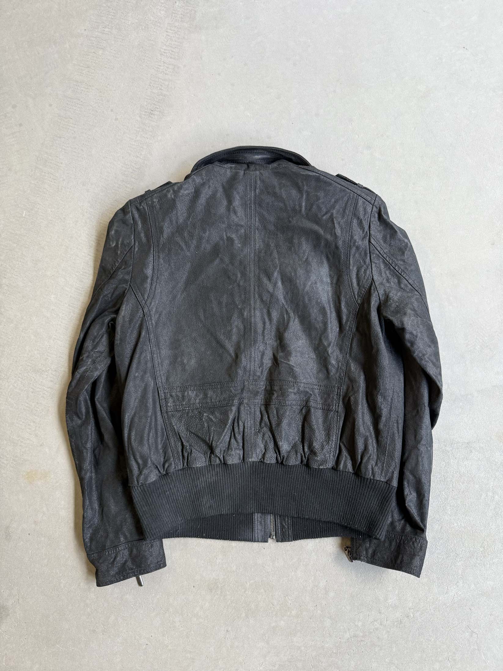 This Vintage Lisa Tossa Flight Bomber Leather Jacket is made of genuine leather. It features a suede finish, shoulder details, front pockets on either side, zipper details on the sleeves and an elasticated fabric hem.